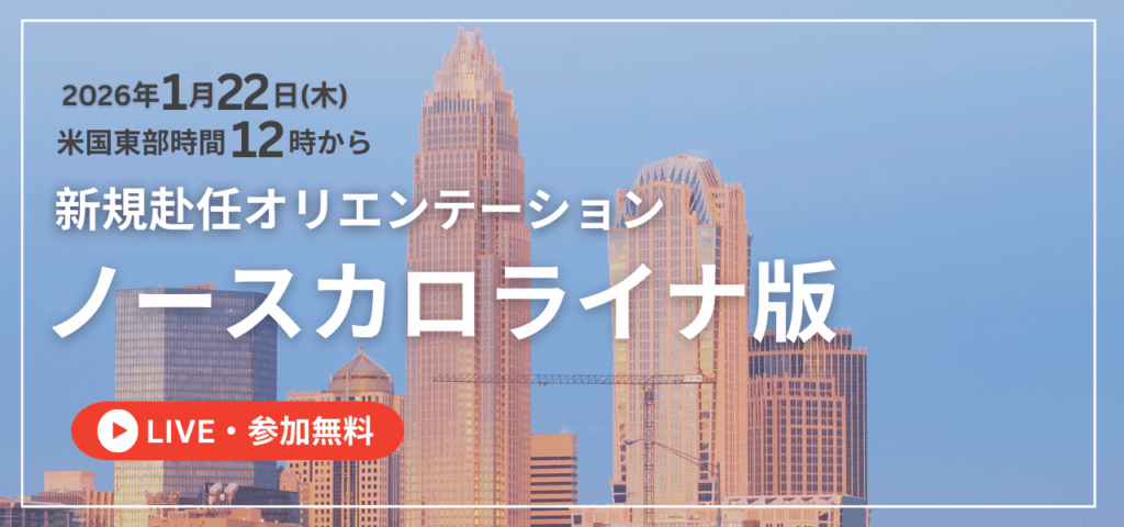 米国ノースカロライナ州(シャーロット・ラーレー)へ新規に赴任された皆様向けに、「どのエリアを選ぶべきか」「生活環境や住宅事情はどうか」「赴任後の手続きはどんなものがあるか」についてご紹介するためのウェビナーを開催します。