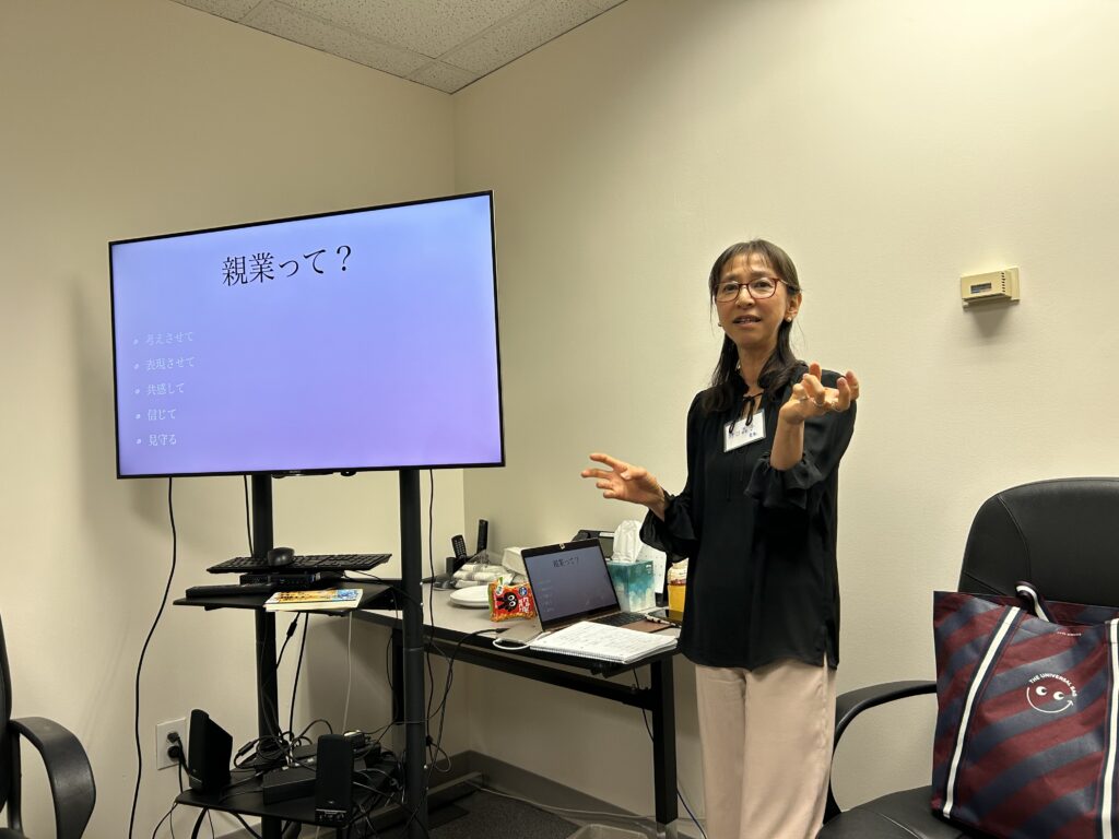 NJオフィスにて、パパママ広場を開催しました。大人8名(パパ2名含む)とお子様2名に参加頂き、賑やかな会となりました。今回は、元教師で4人のお子様を育てられた野口晶子さんをゲストスピーカーにお招きし、「バイリンガル子育て」をテーマにお話し頂きました。事前に参加者に質問を募り、野口さんにその質問にお答え頂く時間を設け、とても活発な意見交換ができました。参加者のみなさまからは下記の感想を頂いています。